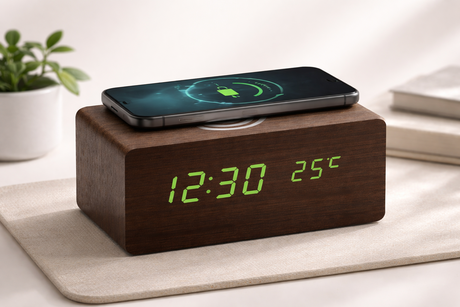 SYNCLOCK – Orologio Digitale in Legno con Ricarica Wireless